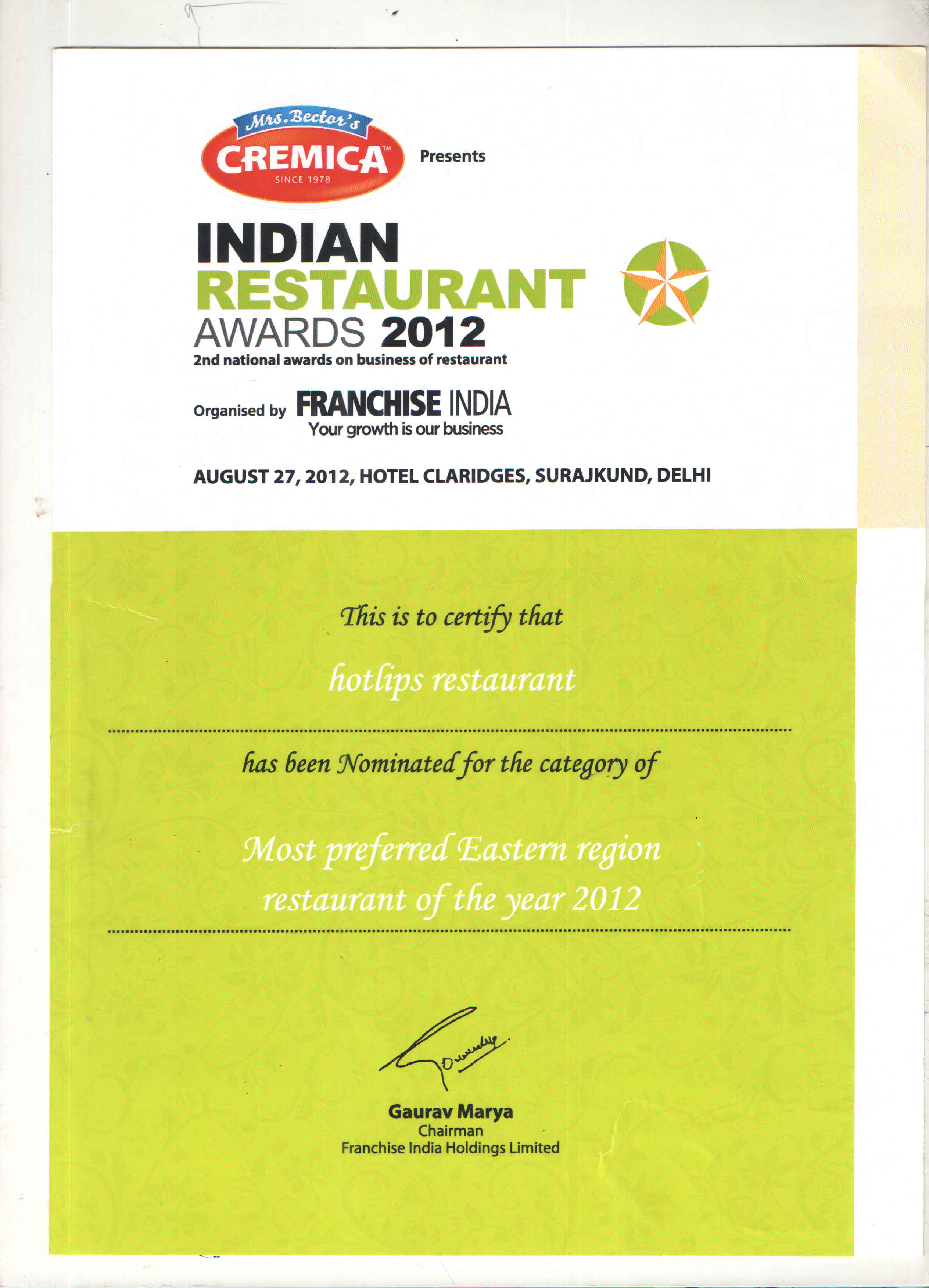 Certificate Of Gokul Restaurant